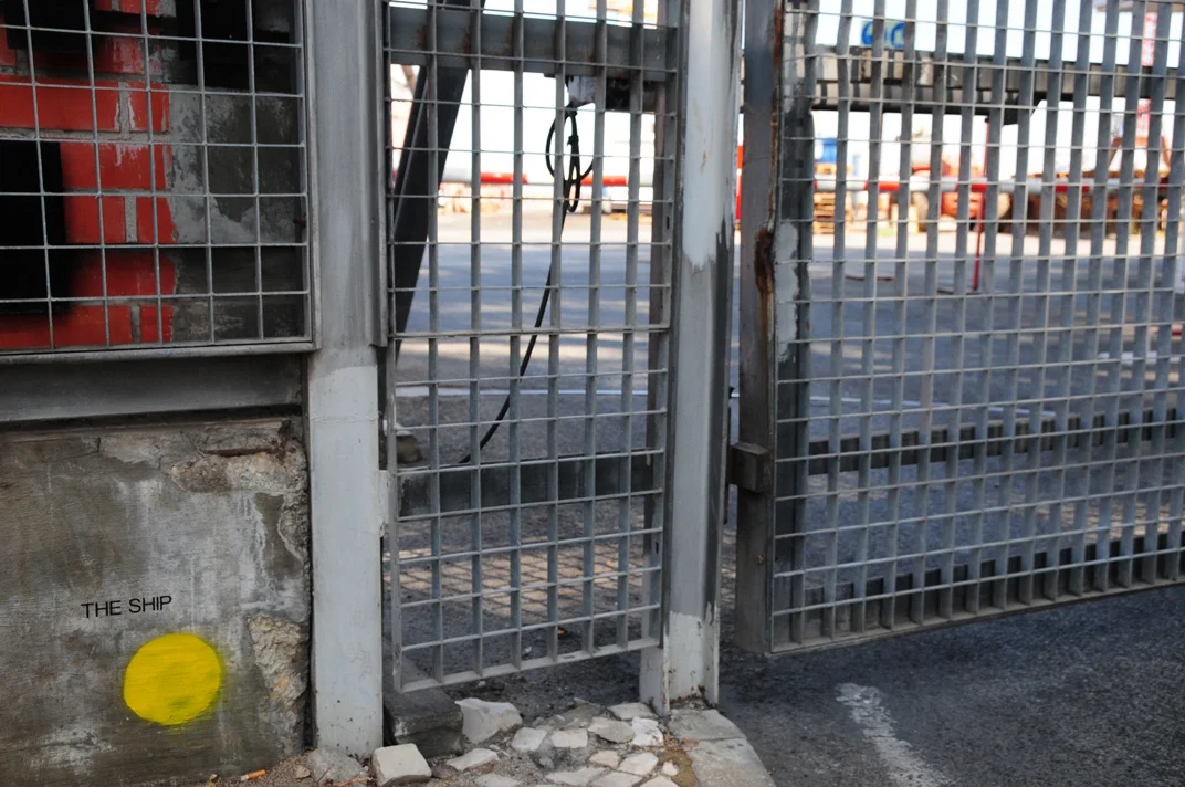 A zone of propriety will keep you from the edge. Instead you must move inland, just a bit. Walk past walls of colourful communication to your right – keep on following the dots. A train passes ahead. The sound of traffic rises as the line of the pine extends. This barrier to your left is high: its heavy mesh marked by a descending metric. Continue along it until you curve into the rush. Now, with the wood pressing up against the gridded metal mesh, is your opportunity to peep through the barrier. Take stock of the dockyard it encloses. Listen to THE RHYTHM it brings forth.