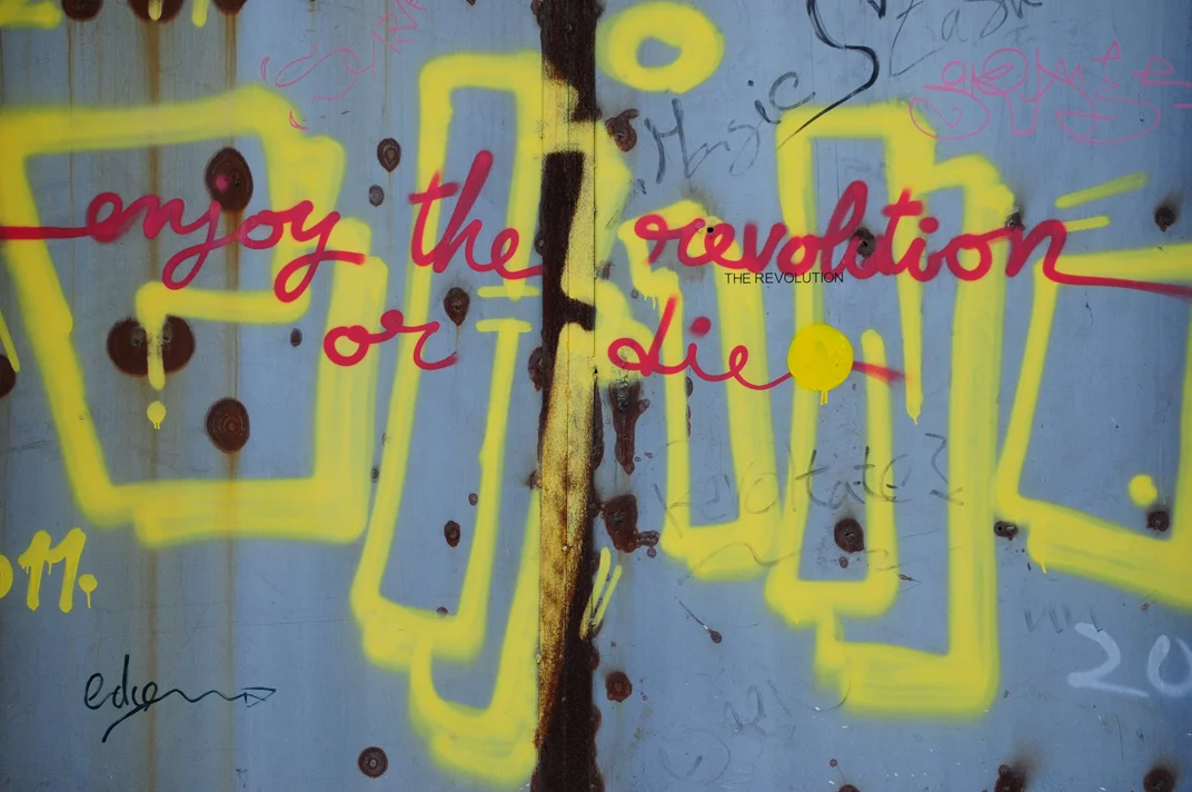 Turn around to take your leave. Before you know it, you will already arrive in the meadow. Trees drop debris in the slanting light. You would like to stay for a while, to sit on that rock and observe the light (as you do so, look up at the hole in the grid – this small detail says so much about the confrontation between two orders) but it is time to return to the edge. So move now out of tranquillity toward the incendiary door and enjoy THE REVOLUTION or die.