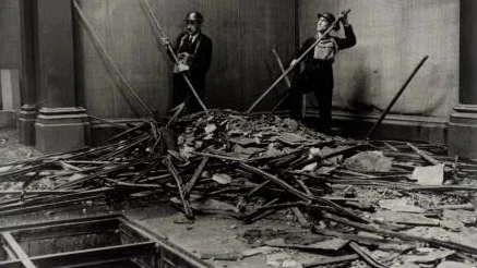 'Early one morning I was awoken by a terrific explosion to feel the massive building violently shaking and to hear an avalanche of masonry and glass... Since the raid was still in progress we could not use our torches, but by the inadequate light of the stars and bursting shells we crept through the wreckage from room to room, cautiously, because the firing of the A.A guns brought down cascades of loosened roof glass. Outside the building on the east side, what half an hour before had been a road, pavement, lawn, and flowerbeds was now merged in one indistinguishable desolation...'