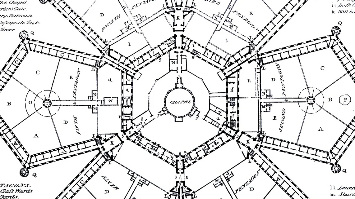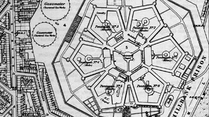 Built on this same ground, Millbank Prison was opened in 1816 and closed in 1890. The prison’s architectural plan comprised a central circular chapel surrounded by a three-storey hexagon whose interior and exterior angles, like that of an octagon, are equivalent, and whose geometry characterises, for example, beehive honeycombs, the scutes of a turtle's carapace and a polar cloud on Saturn. (Metropolitan France also has a vaguely hexagonal shape.) Radiating out from Millbank Prison’s central circle and hexagon were six pentagons of cell blocks set around a cluster of courtyards.